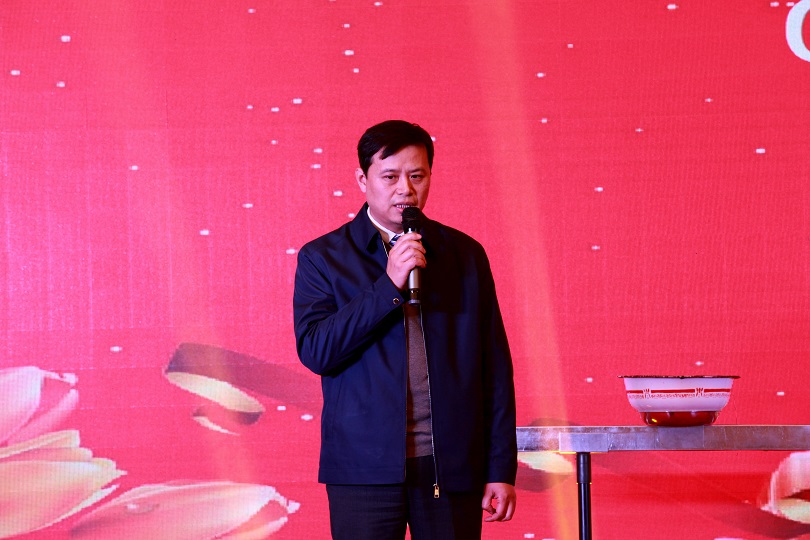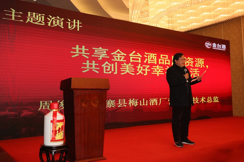 周俊东在会议中做了《共享金台酒品牌资源,共创美好幸福生活》的主题演讲。周俊东分析了金台酒的六大优势:一是将军故里,厂史悠久,好山好水酿好酒。二是茅台工艺,黔源皖韵,徽派酱香新潮流。三是原料自给,有机生态,美酒品质有保障。四是恒温洞藏,陶缸封存,老熟陈酿绵柔香。五是大师鉴证,茅台品质,传承创新享殊荣。六是合作共赢,利益分享,万股同心创辉煌。