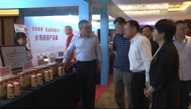 希望之城,养心金寨。2019年5月23日,金寨旅游推介会在有“江南鱼米之乡”之美誉的昆山举行。梅山酒厂携“金台酒”系列产品参加了会议,受到普遍关注和赞誉。县委副书记、县长汪冬陪同国家人社部领导和昆山市委、市政府领导参加金台酒展位并介绍产品, 安徽金台酒销售公司总经理赵鸿伟接受新浪微博采访 。